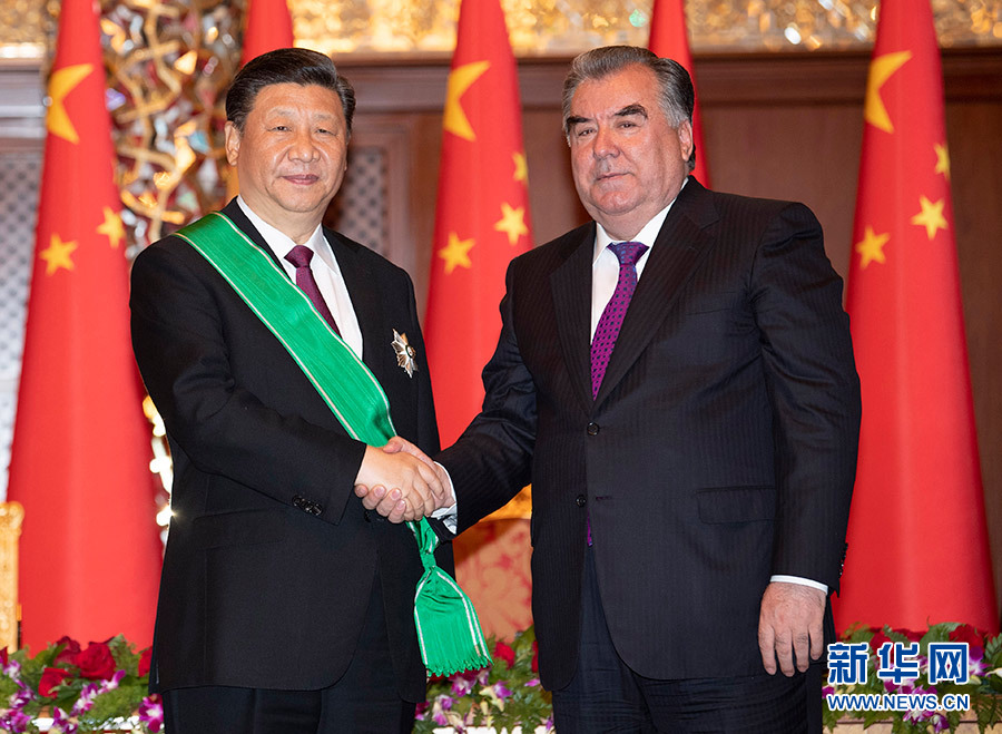授勋仪式在总统府举行。塔方司仪宣读授勋总统令后,拉赫蒙为习近平佩挂塔吉克斯坦国家最高勋章“王冠勋章”。两国元首亲切握手,合影留念。
