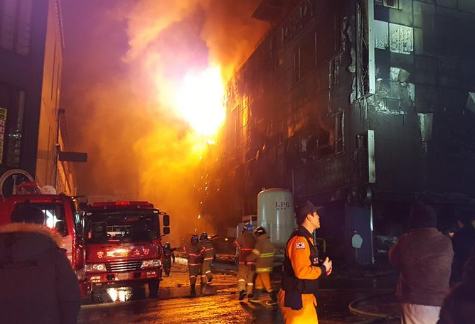 12月21日,在韩国堤川市,消防人员在发生火灾的运动中心灭火。韩联社援引韩国消防部门消息称,韩国堤川市一运动中心21日下午发生火灾,目前已造成16人死亡。新华社/纽西斯通讯社