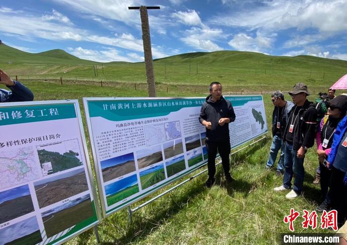 6月25日,海外华文媒体甘肃行采访团在玛曲县欧拉镇欧强村黄河沿岸阻沙林带治理点采访。九美旦增 摄