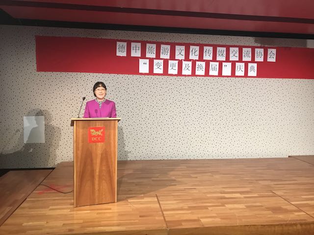 接着,协会的新任主席寒梅女士也随后上台作就任演讲,协会副主席Erika Ranker女士随行作德语翻译。寒梅主席说,此次庆祝协会换届仪式也将是一次隆重的庆典。十周年对于一个协会而言,是一座代表着拼搏奋斗的里程碑。作为德中旅游文化传媒交流协会的新任主席,她很高兴与大家齐聚在这里共襄盛举,这将是一次代表团结共荣的大会。寒梅主席真诚感谢终身名誉主席吴志芬女士对协会十年如一日的付出与努力,并积极介绍了协会这些年的发展情况与未来即将进行的事情。她表示协会今后将始终秉承冯海阳总领事在2016年四月双方正式会面时提到的,希望协会充分发挥自身社团的特色,成为一支多干事、干实事、干成事,与其他社团差异性发展的优秀队伍的指导性倡议。她将承袭吴志芬主席发展协会的初衷和愿景,砥砺前行、不忘初心。寒梅主席表示此次庆祝活动的纪念品其实具有深远涵义,茶叶、丝绸、瓷器作为国粹,早在中国华夏时期开始,就是中国对外通商、友好缔约的国礼,用来馈赠八方朋友。协会就是希望以见微知著的方式让中华文化在海外良好的传播,并愿同德国其他友好社团一起携手,为共建德国“美好侨界秩序、最美侨团文明、大美华裔精神”而做出坚实努力。